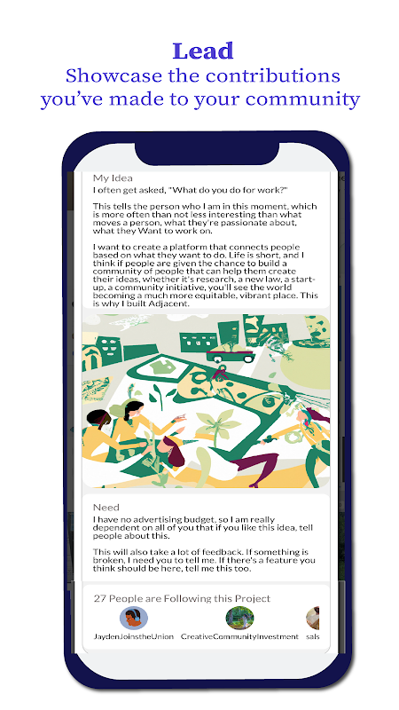 Adjacent è un incubatore virtuale per te e la tua comunità. Adjacent consente ai creatori di progetti provenienti da un'ampia gamma di discipline (business, arte, attivismo e ricerca) di trovare efficacemente collaboratori e costruire la comunità di cui hai bisogno per ottenere consigli pratici quando avvii e amplia il tuo progetto.