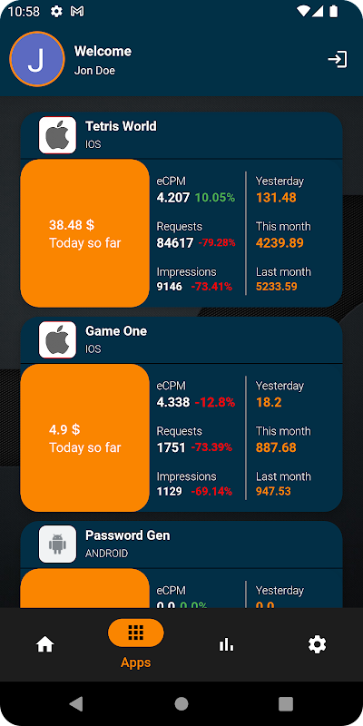 - Visualizza grafici e rapporti per guadagni, eCpm, impressioni, richieste, tassi di corrispondenza con filtri di query.