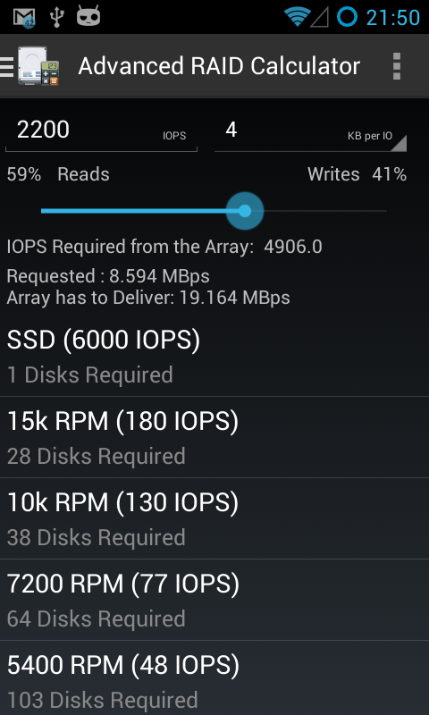 L'applicazione fornisce anche un calcolatore di IOPS per trovare il tipo di disco necessario per il raggiungimento degli IOPS nel backend così come una calcolatrice fabbisogno di potenza per aiutare nella scelta della PSU appropriata per la messa a punto.