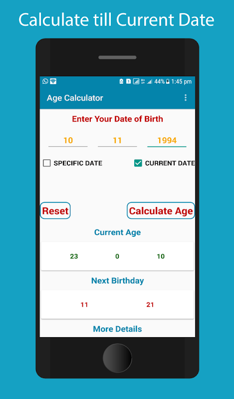 Age Calculator Mobile app developed for calculating age and remaining days of next birthday of a person from the date of birth to any specific or current date. Taking into account the date of birth and specific date to that calculation is required for an individual, this app efficiently and correctly calculates the age of that individual.