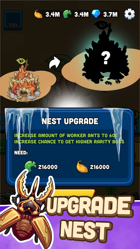 Man mano che accumuli risorse, puoi usarle per aggiornare il tuo nido e sbloccare nuovi insetti. Puoi aumentare le dimensioni della tua popolazione di formiche operaie e generare generali bug per guidare il tuo esercito.