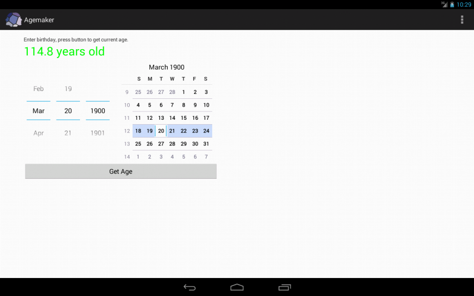 Agemaker calculates age as decimal years. Users enter a birthday and press a button to reveal the age as decimal years. Researchers or clinicians often want to record the age, in decimal, at a given time instead of a birth date and current date. Interface works in English or Spanish. No data is ever recorded or transmitted by this app. Image credit: Sarah Neff