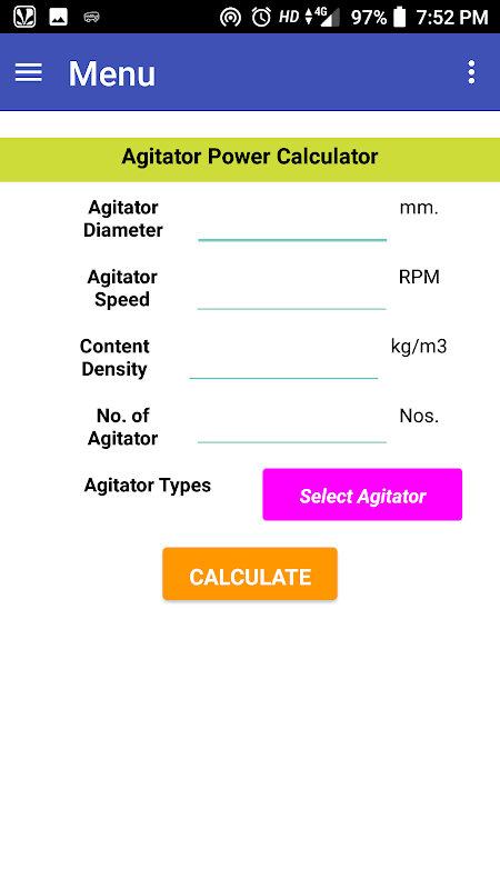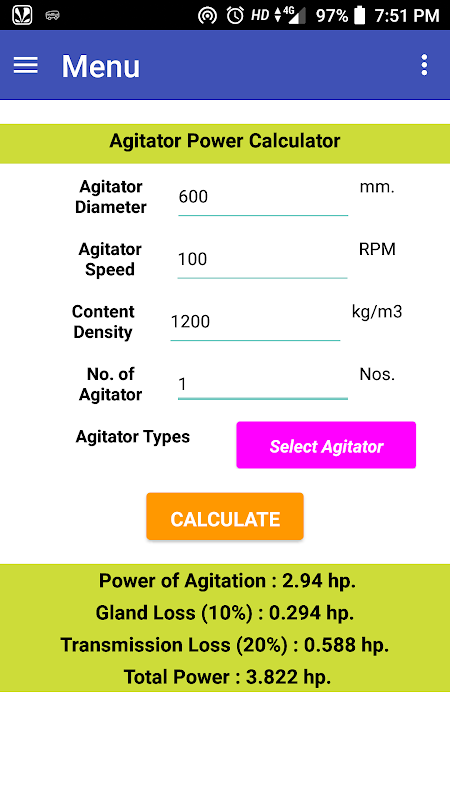 Questa App Calcolare potenza richiesta per Agitator o nel Mixer