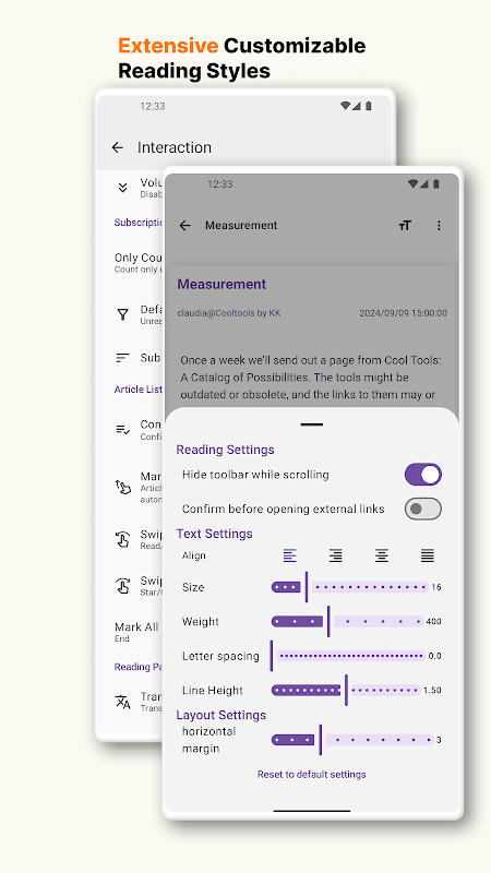 - Ricche opzioni di personalizzazione: configura gli stili di testo della pagina di lettura, contrassegna tutto come letto, opzioni di contrassegno dello scorrimento e altro ancora per un'esperienza di lettura su misura.