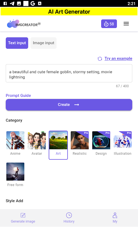 Generate AI Art in 3 simple steps, 1. Write a prompt in the text box or let app generate one for you, 2. Select Category and Style and 3. Click Create and wait for you AI image.