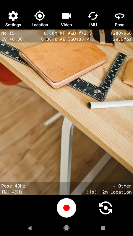 L'app è stata creata principalmente per consentire un ottimo controllo manuale sulla registrazione video (ad esempio per eliminare completamente il motion blur), mentre in parallelo cattura i dati IMU e GPS sincronizzati nel tempo. Ciò rende l'app particolarmente adatta per estrarre fotogrammi fissi (o sequenze video) da video registrati per scopi di apprendimento automatico / rete neurale / CNN. I dati registrati sono ideali anche per SLAM visivo-inerziale, odometria visiva, mappatura, algoritmi di ricostruzione 3D, ecc.