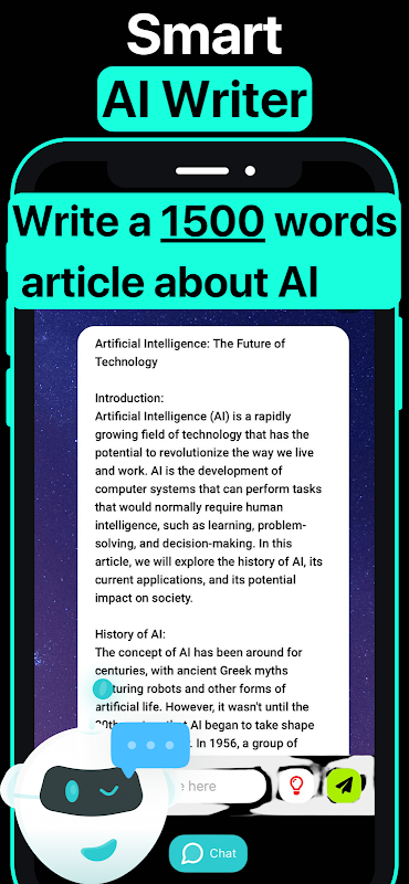The Chat AI Pro Chatbot built on Chat GPT App with GPT 4 has turbo features designed to provide suggestions and complete sentences based on the user's input. It's like having your own personal AI writing assistant & chat powered by AI in your pocket.