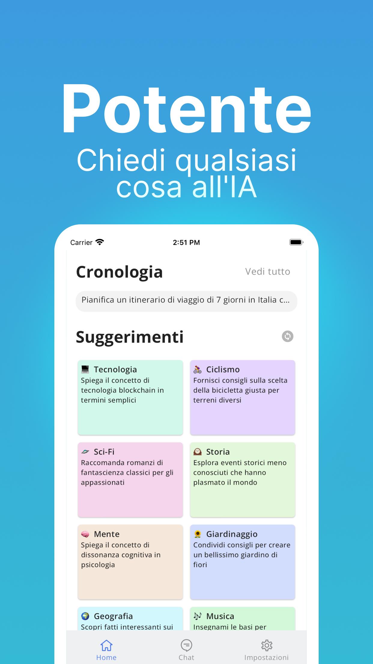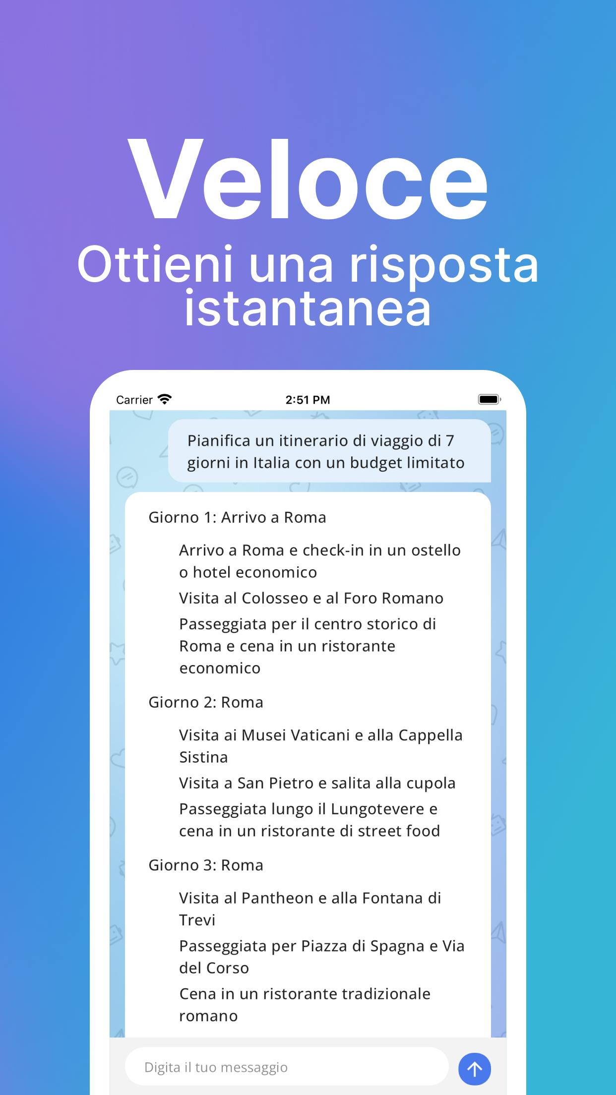 Conversazioni coinvolgenti: Avvia una conversazione con ChatGPT su qualsiasi argomento che ti interessa. Che si tratti di eventi attuali, intrattenimento, scienza o sport, ChatGPT è la tua fonte di conoscenza.