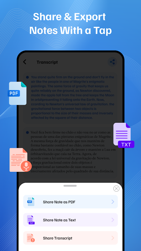 L'app AI Notes & Transcript offre opzioni di condivisione fluide, che ti consentono di condividere note come PDF o testo semplice o persino inviare direttamente il contenuto trascritto con facilità. Con il supporto di un'ampia gamma di lingue, AI Audio Transcribe semplifica la trascrizione e la traduzione dei dati audio, garantendo l'accessibilità per gli utenti globali. Che tu stia catturando una discussione importante in tempo reale o trascrivendo un file caricato, questa app AI Audio Transcribe fornisce una soluzione veloce, affidabile ed efficiente per convertire le parole pronunciate in testo strutturato e condivisibile.