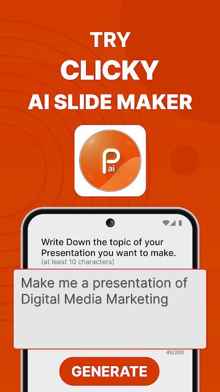 Con Presentation AI: Slideshow Maker puoi creare presentazioni visive straordinarie in pochi secondi. Questo strumento intelligente cambierà il modo in cui progetti, scrivi e presenti i tuoi contenuti dal tuo telefono. Che tu sia uno studente, un imprenditore o un professionista, questa app per diapositive e presentazioni ti aiuterà senza problemi a progettare slide professionali per la tua presentazione.