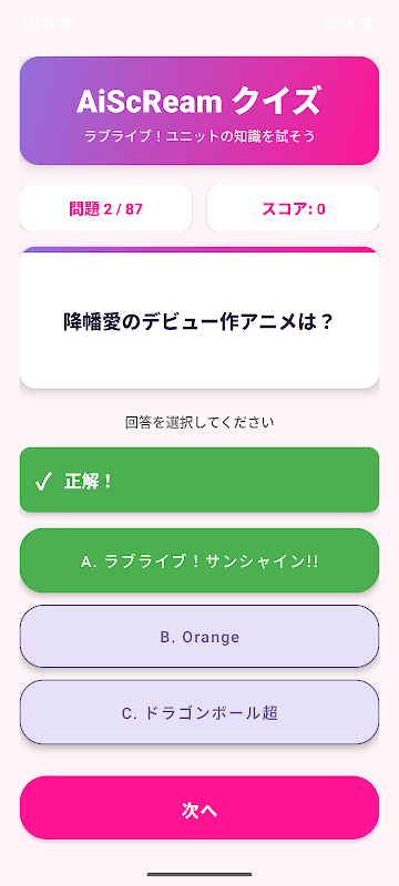 Un'app di quiz sui doppiatori dell'unità AiScReam di Love Live!. Metti alla prova la tua conoscenza di Ai Furuhata, Aguri Onishi e Wakana Okuma!