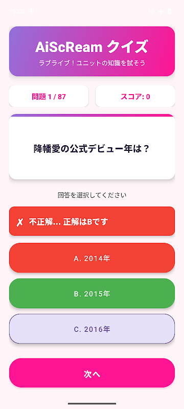 AiScReam Quiz è un'app di quiz che ti permette di scoprire in modo divertente i tre doppiatori (Furihata Ai, Onishi Aguri e Okuma Wakana) membri del popolare gruppo "AiScReam" della serie Love Live!.