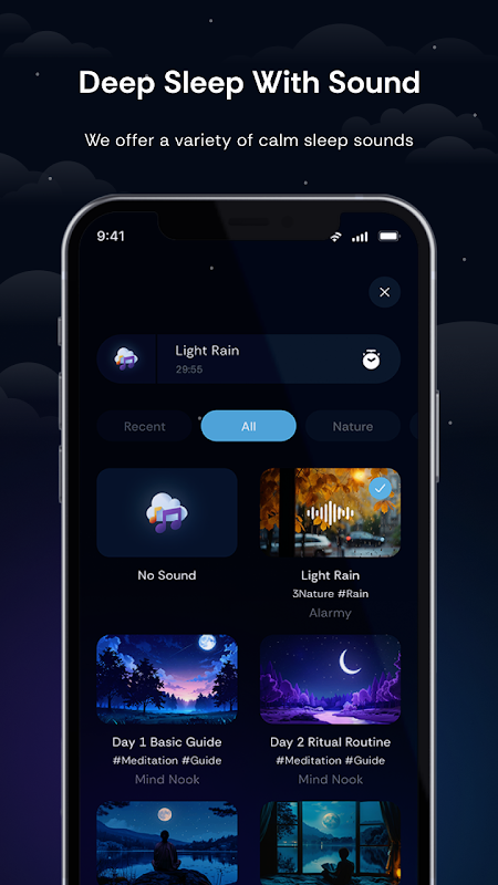 Addormentati più velocemente con suoni rilassanti per dormire, playlist ambientali e opzioni di rumore personalizzabili.