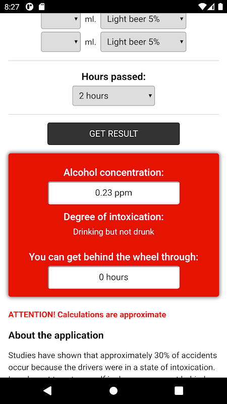 5. Quindi il nostro calcolatore di alcol calcolerà il contenuto di alcol nel sangue stimato, ti fornirà una "diagnosi" e scriverà se puoi guidare un'auto in questo stato.