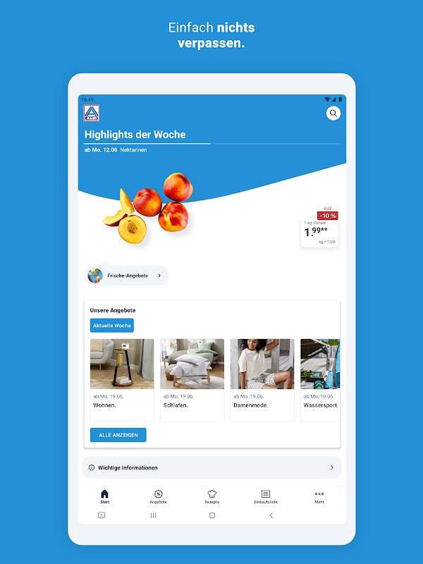 Ti sei perso un'offerta imperdibile? Con l'app ALDI Nord, questo non sarebbe successo. Hai accesso a tutte le offerte attuali, ordinate per data di vendita. Puoi cercare, filtrare o semplicemente lasciarti ispirare. E quando trovi qualcosa, aggiungilo alla tua lista della spesa e l'app ti ricorderà automaticamente quando iniziano i saldi (questa funzione può essere disattivata se lo desideri). Oppure puoi impostare un promemoria per un orario a te più comodo, ad esempio durante la giornata dedicata alla spesa.