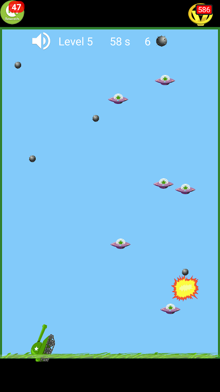 The skies of planet earth are dark with the alien spaceships hovering over and their intentions don't look benign. All of earth's defenses have been overrun. You are the ONLY hero left and the LAST defense. The good news is that all the other heroes did massive damage to the aliens and there are only a limited number of alien spaceships left. Your goal is to eliminate all the remaining spaceships and bring glorious victory to planet Earth !