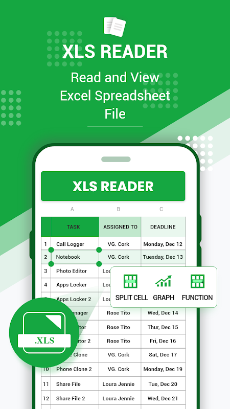 ✏. Visualizzatore di file XLS: questa opzione contiene gli strumenti più produttivi per aprire, leggere e visualizzare facilmente i file Excel (XLS). Gestisce i file rapidamente, apre o visualizza i tuoi documenti📃. È possibile aprire documenti salvati nella memoria interna, memoria esterna (schede SD) o anche file scaricati o inviati come allegati e-mail📃.