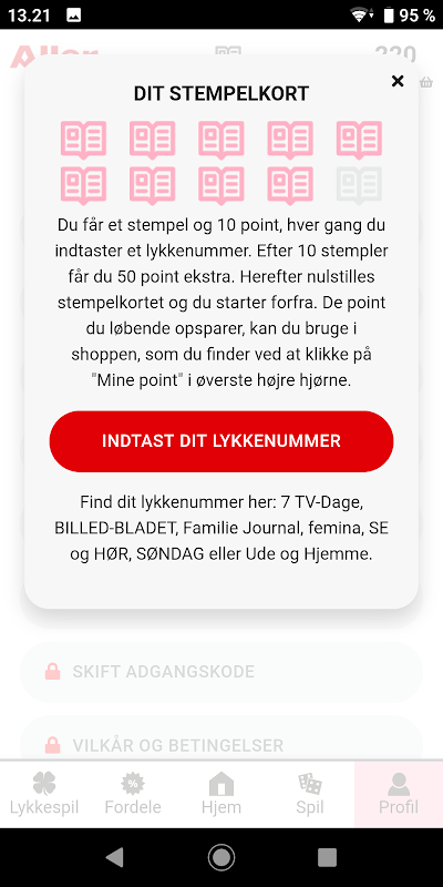 Hver gang du køber et Aller ugeblad (7 TV-dage, BILLED-BLADET, Familie Journalen, femina, SE og HØR, SØNDAG og Ude og Hjemme), kan du indtaste/scanne en unik lykkekode og optjene point. Dine point kan du bruge i pointshoppen. Samtidig giver hvert lykkenummer et lod til Det Store Lykkespil.