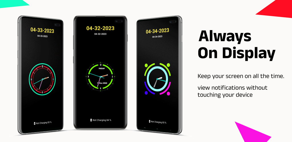 The best always on display app with lots of customization options. Get information such as time, date, battery percentage, notifications, etc. always on your screen with Always On Screen. Always On Screen app brings the always on display feature to your device. No need to turn your screen on again and again just to see the time or date.