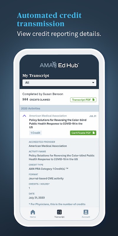 Ora con la nuova app AMA Ed Hub Transcript completamente gratuita puoi accedere rapidamente alla tua trascrizione, certificati e premi AMA dal palmo della tua mano. Niente più fogli di calcolo manuali o documentazione cartacea, l'app AMA Ed Hub Transcript farà il lavoro amministrativo per te. Questa nuova app aiuta gli studenti di medicina, i medici e i professionisti della medicina a gestire facilmente il credito e le trascrizioni della formazione continua.