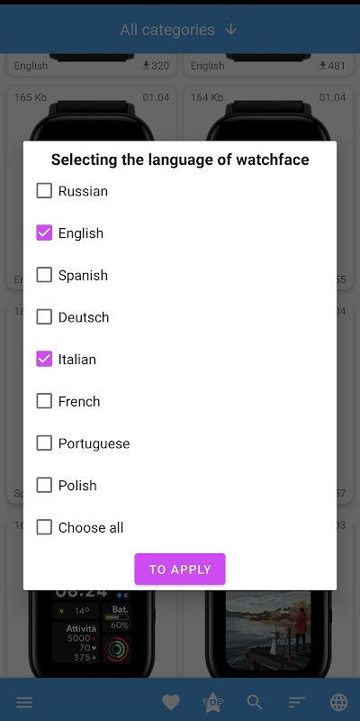 Nel menu in alto potrai trovare le categorie di WatchFace per argomento. Assolutamente tutti i quadranti sono divisi in categorie, il che rende facile trovare i quadranti sull'argomento desiderato 💕