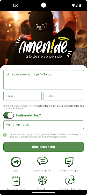 Sulla nostra piattaforma di preghiera e intercessione Amen.de, puoi condividere le tue preoccupazioni e i tuoi problemi con persone che pregheranno Dio per loro. In modo anonimo, ma personale.