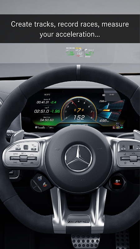 AMG TRACK PACE è ricco di funzionalità innovative per la tua corsa all'interno del tuo veicolo all'interno del display Head-up, del display multimediale e del display dello strumento digitale, che viene migliorato con l'app per smartphone collegata all'hotspot WiFi del veicolo. Con ciò, puoi catturare le tue emozioni mentre hai il massimo controllo sulle tue prestazioni di guida mentre corri.