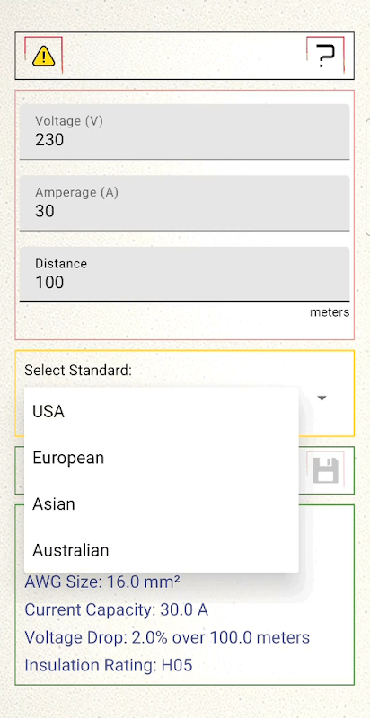 Un'app di utilità per il calcolo delle specifiche dei cavi, inclusi diametro, dimensione AWG, capacità di corrente e caduta di tensione, in base alla tensione di ingresso, alla corrente e alla distanza. L'app presenta componenti dell'interfaccia utente interattivi per il salvataggio, la visualizzazione e l'eliminazione dei risultati con l'integrazione del database. Fornisce agli utenti una clausola di esclusione della responsabilità e dettagli sulla formula per garantire accuratezza e conformità. L'app supporta anche più standard (USA/internazionale) per la misurazione della distanza.