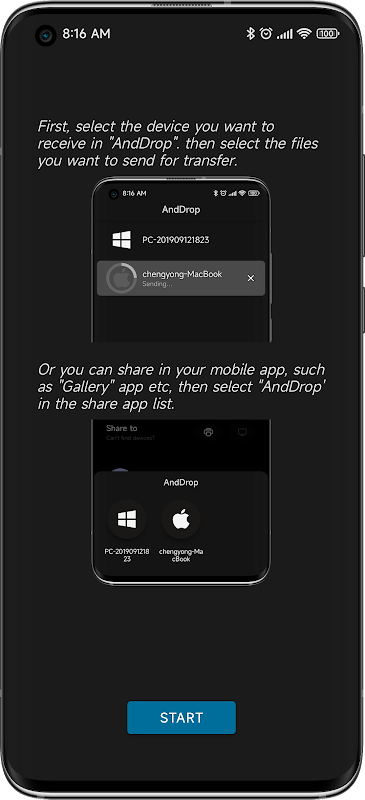 AndDrop può aiutarti a trasferire facilmente i file sui tuoi sistemi macOS e Windows 10 e versioni successive. Non è necessario installare alcun software sul computer. macOS deve solo aprire "AirDrop" integrato e "Permettimi di essere scoperto da" modificato in "Tutti". Per Windows 10 e versioni successive, puoi aprire "Condivisione nelle vicinanze" nel Centro di controllo, quindi selezionare direttamente il dispositivo cercato nell'app AndDrop, oppure puoi condividere nell'app mobile, come l'app "Galleria" ecc., quindi selezionare " AndDrop" nell'elenco delle app di condivisione.