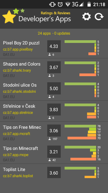 This application shows the changes and increases of ratings and reviews of added applications in list. You can watch your own apps or competitive applications. It can be helpful especially for larger developers having more than 10 applications in Google play store. This is alternative application of Google Play Developer Console, but without login and password. We are working only with public data.