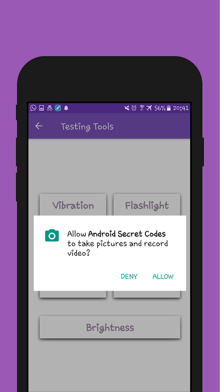 In your device, secret(hidden) codes are available. When those codes are typed manually from the phone dialer, they will unlock a hidden menus with more options and information for your Android device. Now is not necessary to remember all those codes, they can be executed only with one finger tap! Enjoy and have a fun!