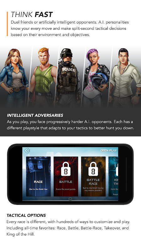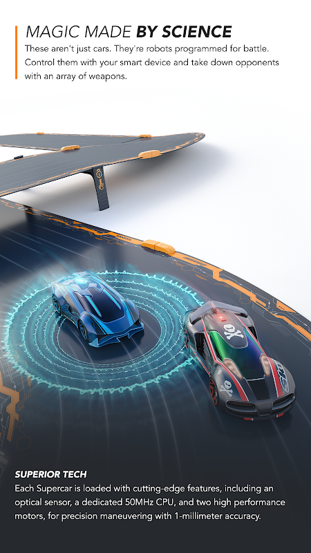 Each Supercar is a self-aware robot, driven by powerful artificial intelligence (A.I.) and equipped with deadly strategy. Whatever track you build, they'll learn it. Wherever you drive, they'll hunt you down. The better you play, the better they become. Whether you battle A.I. opponents or friends, your tactical options are unlimited. And with continuous software updates, the gameplay always stays fresh. Customize weapons. Swap out cars. Build new tracks. It’s easy to pick up, and nearly impossible to put down.