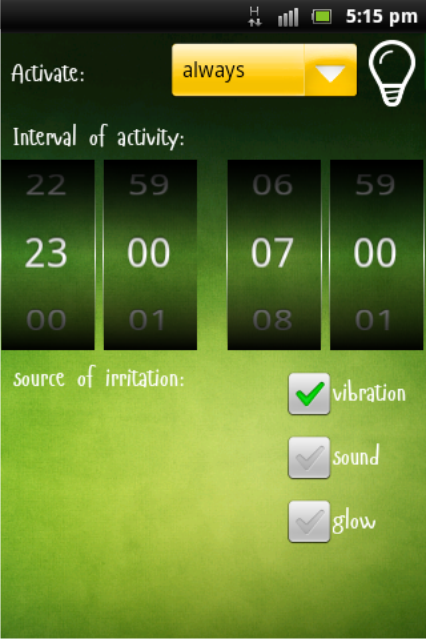 Programma risveglia da tre metodi (l'utente può scegliere qualsiasi): flash, vibrazione, suono sgradevole. Nella versione completa, è possibile selezionare tutti e tre contemporaneamente.