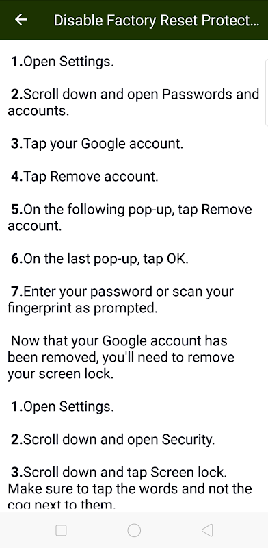 Questa app ha Cos'è FRP Bypass, FRP Bypass Methods OTG, FRP Bypass Methods without OTG, Disattiva FRP, Factory Reset Later Methods, Disable Factory Reset Protection e molto altro.