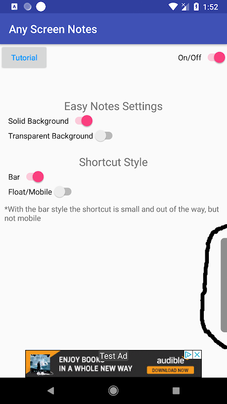 Any Screen Notes makes it easier to make and read notes. Enabling Any Screen Notes will make it possible to take notes from ANY screen. All you will have to do is touch a translucent, floating button. The button will float over every screen, allowing you to access your notes everywhere! Clicking on it will open your notes, and if you want, you will still be able to see what was on your screen before! This overlay is customizable, tailored to your preferences. Taking notes has never been this easy!
