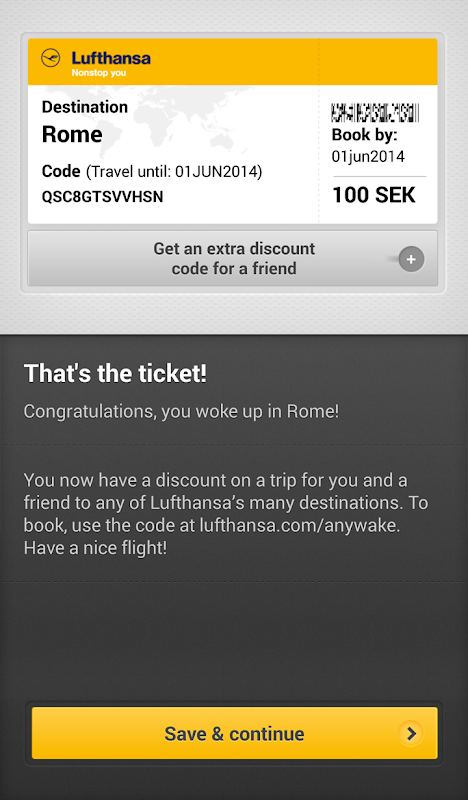 Anywake is an alarm clock that takes you places. To take off, choose a standard sound and use Anywake everyday. About every other morning you will wake up to the sound of a randomly selected city. To turn off the alarm, you have to guess which one. And if you get it right, you get a discount on a flight to one of Lufthansas many destinations. If you snooze you loose. Sleep tight, good luck and wake up anywhere