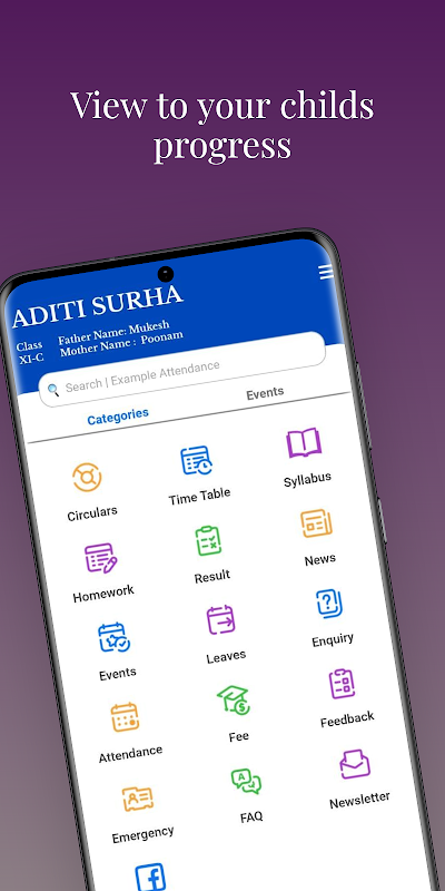 Questa app consente ai genitori di visualizzare facilmente i dettagli dei propri studenti, come voti, record di frequenza, compiti e annunci scolastici importanti, il tutto in un'unica piattaforma centralizzata. Con aggiornamenti in tempo reale e interfacce facili da navigare, i genitori possono rimanere attivamente coinvolti nel percorso educativo dei propri figli, favorendo una connessione più forte tra casa e scuola. Questa app non solo migliora la trasparenza, ma consente anche ai genitori di sostenere attivamente il progresso accademico dei propri figli, garantendo un'esperienza educativa completa e di successo.