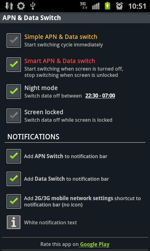 L'app fornisce APN personalizzato basato su timer e commutazione DATI . Per avere e-mail e app sincronizzate e risparmiare energia della batteria impostare 1 minuto per il timer durata Apn e 10 minuti per il timer durata disattivazione dati.