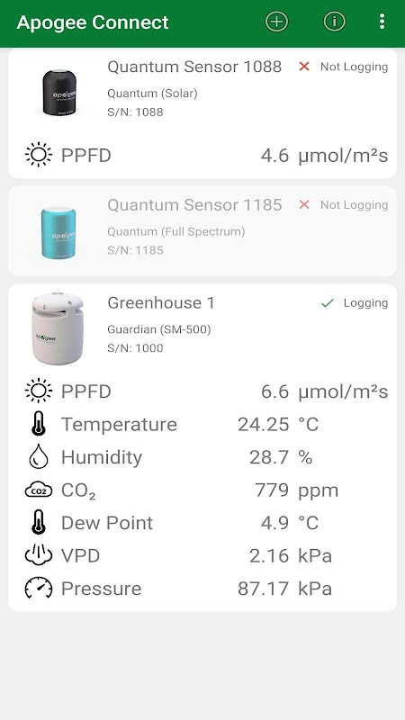 Apogee Connect si interfaccia con un registratore di dati in miniatura creato da Apogee Instruments tramite Bluetooth Low-Energy. Questo registratore di dati in miniatura, chiamato microCache, è in grado di raccogliere dati da molti dei sensori analogici di Apogee Instrument.