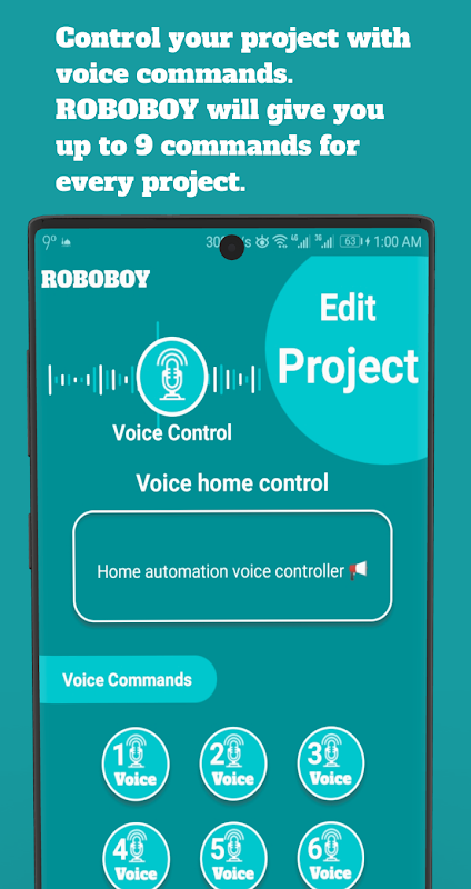 Con i servizi vocali di Google, ROBOBOY consente fino a 9 comandi vocali per progetto. L'app abbina i comandi vocali pre-salvati e invia il comando corretto, offrendo un'esperienza di controllo a mani libere.