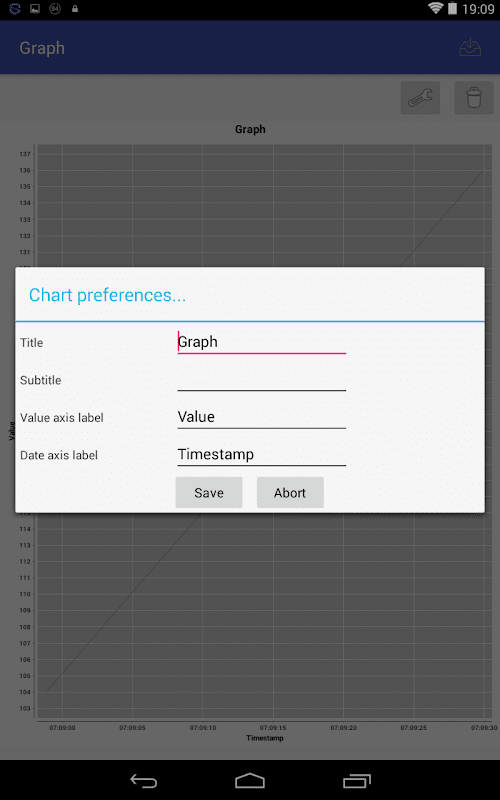Diese App dient zum anzeigen von Daten welche über die Serielle Schnittstelle geliefert werden. Die empfangenden Daten können dabei als Diagramm angezeigt werden. Das Diagramm aktualisiert sich selbstständig bei jedem neuen Wert. Des Weiteren können die Daten als PDF, CSV und als PNG exportiert werden.