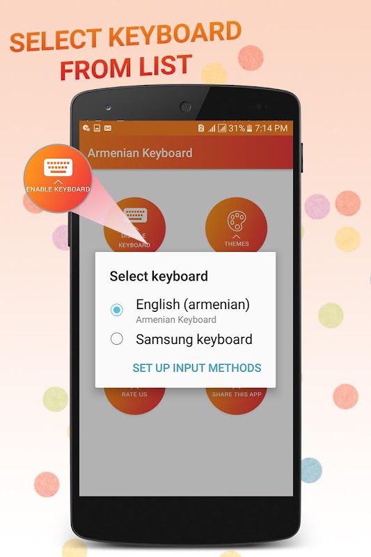 - If you want to turn it into Armenian keyboard just turn Armenian keypad for Android in settings and update your status and sent messages to your loved ones.