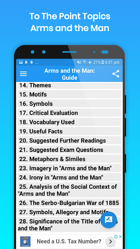 This Guide app works both online and offline, and contains 28 basic topics about one of the famous plays of George Bernard Shaw, Arms and the Man.