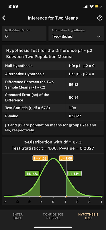 L'app fornisce grafici pertinenti (grafici a barre affiancati o in pila, boxplot, istogrammi) e calcola e visualizza gli intervalli di confidenza e i valori P per verificare le ipotesi. Tutte le informazioni rilevanti (come errori standard, margine di errore, punteggi z o t e gradi di libertà) sono visualizzate ed etichettate in modo chiaro. Il valore P viene visualizzato su un grafico per la distribuzione normale, t- o Chi-quadrato.
