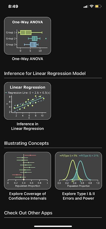 L'app Art of Stat: Inference fornisce l'accesso ai seguenti moduli: