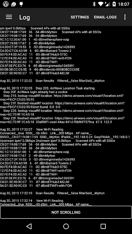 • Una scansione Bluetooth Low Energy (BLE) segnala gli iBeacon, i beacon Aruba e altri dispositivi BLE nelle vicinanze con UUID, valori di indice e misurazioni dell'intensità del segnale. Anche la funzione BluConsole.
