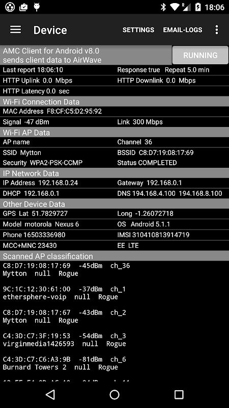 • Un monitor Wi-Fi che mostra l'ambiente Wi-Fi, incluso il punto di accesso corrente, i canali RF, le misurazioni RSSI e le velocità PHY su/giù, altri punti di accesso udibili dal dispositivo ed eventi di trasferimento. Vengono visualizzati i nomi degli AP (se configurati sull'AP, ovviamente).