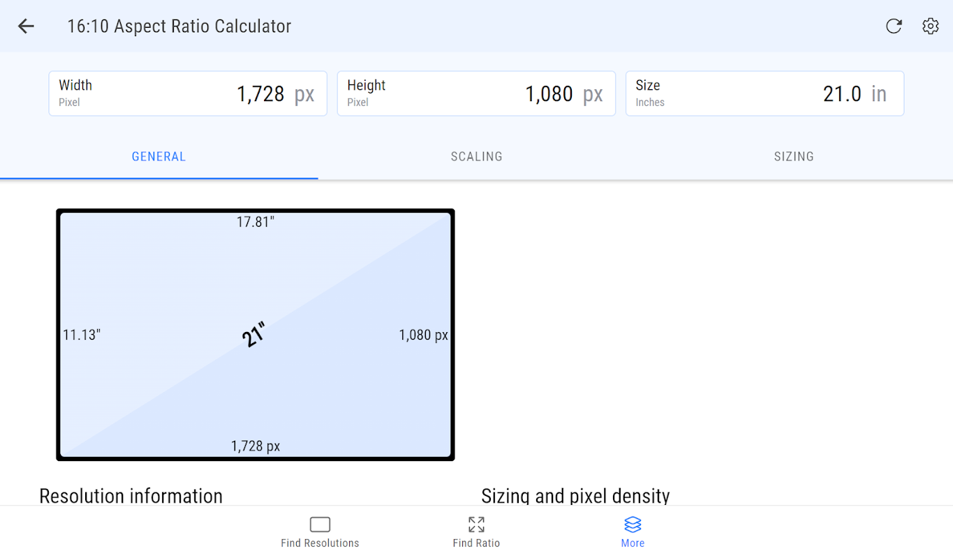 Calcola la risoluzione dello schermo del dispositivo, le proporzioni, il ridimensionamento, la diagonale e altro ancora.