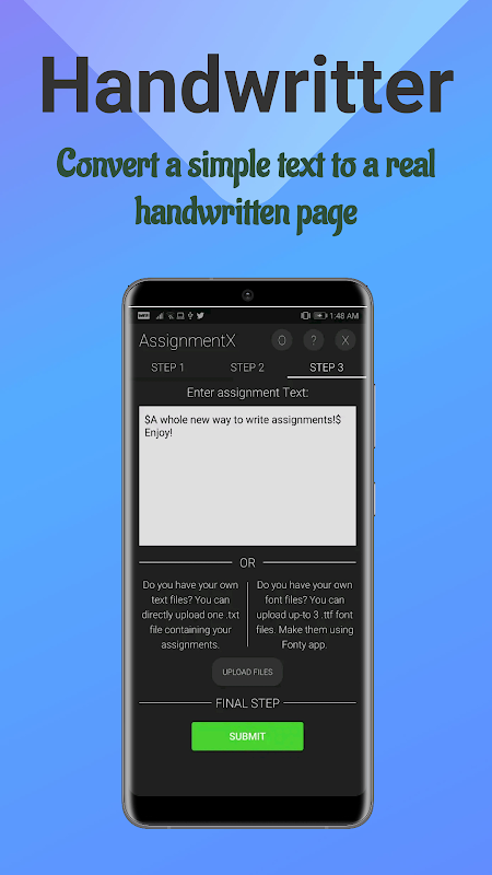 "Assignment Automatic" is an app that reduces the human effort by simply converting a text copied from the internet, messages, Ebook, doc pdf, websites to a handwritten page or you can say that it converts text to handwriting with full customization possible.