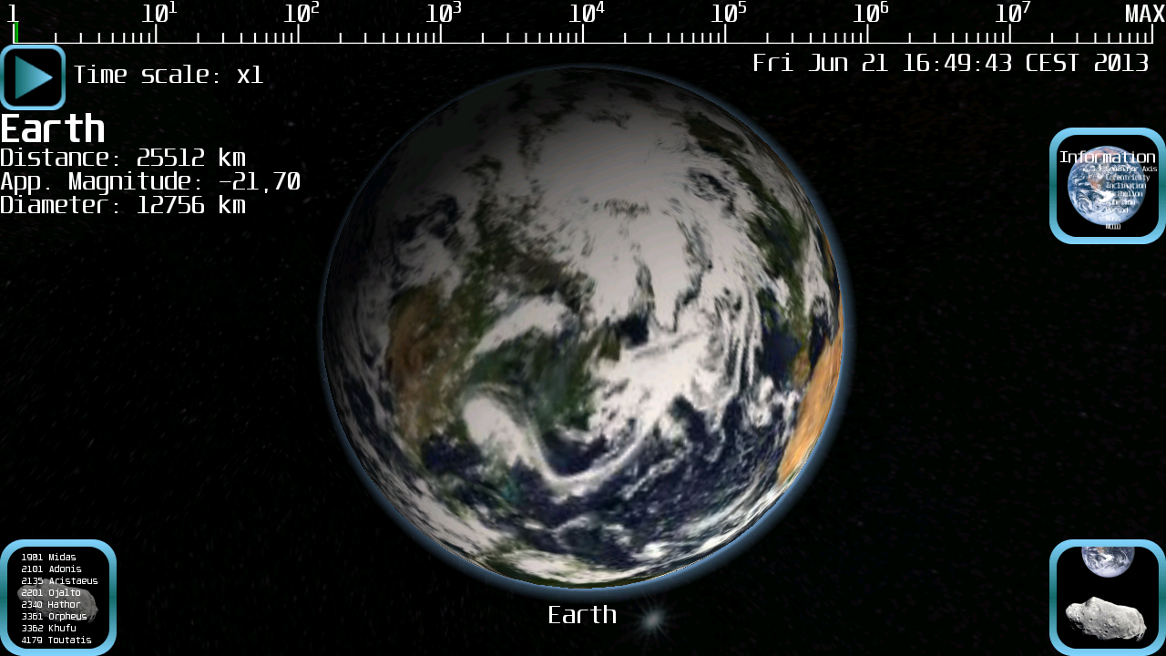 Questa applicazione simula le traiettorie di asteroidi vicini che sono potenzialmente pericolosi per la Terra. È possibile guardare in tempo reale dove sono, stati, o saranno in un dato momento.